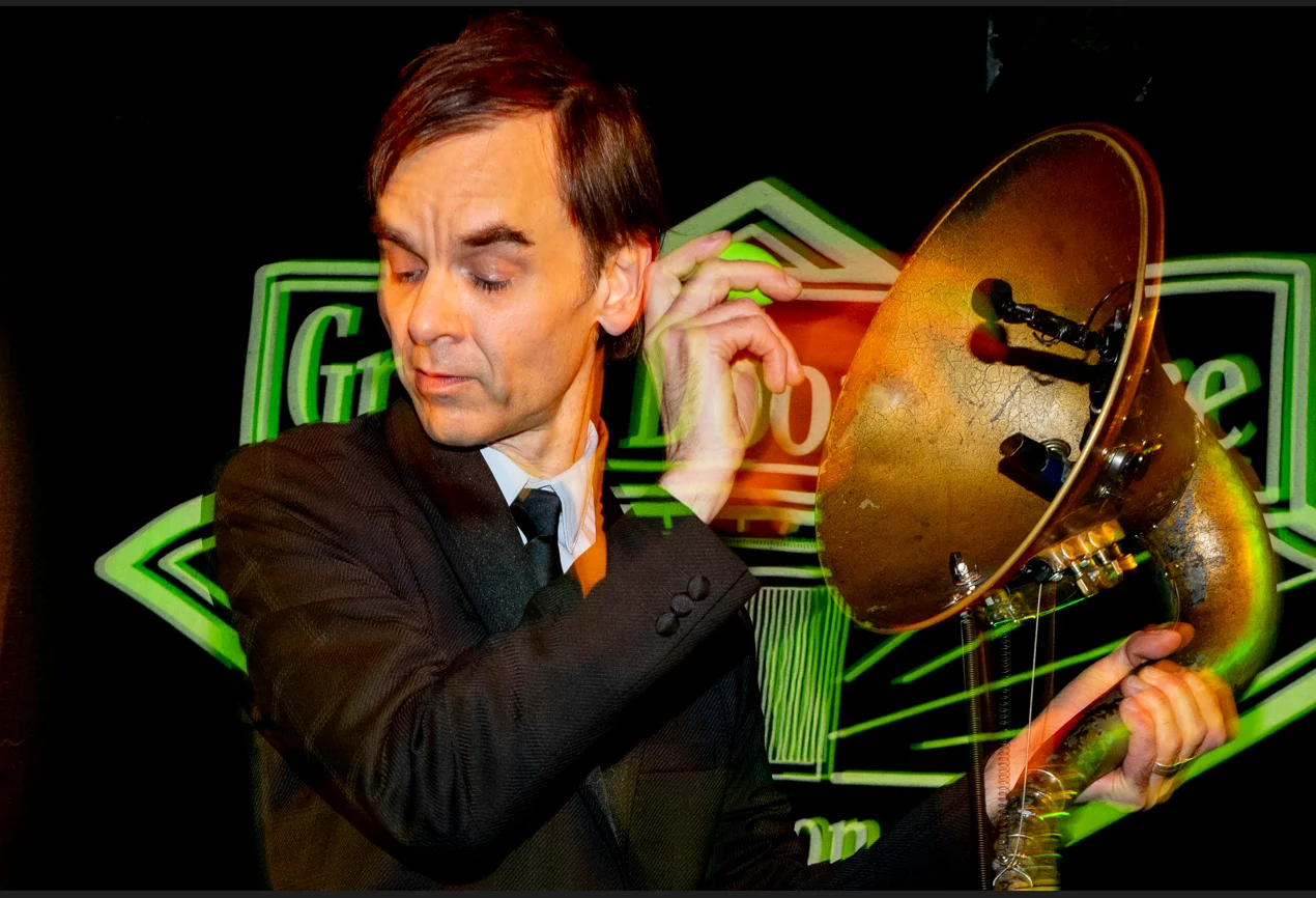 “Both Mother Superior and the Hornicator are here tonight. I built quite a few of my instruments, but not the guitar,” he joked. His beautiful machine Mother Superior sat gleaming. “Mother Superior and Budgie have a ‘thing’… a drummer thing that I don’t really understand. I thought that maybe he wouldn’t like her…she’s a drum machine and drummers tend to find that threatening but Mother Superior and Budgie get along really well.” Thomas honed his technical skills in his day job as an animator for MTV’s Celebrity Deathmatch and Cartoon Network’s Robot Chicken. Born in Colorado, he lived in Berlin and now Birmingham and Dream Catching Songs is his tenth album.