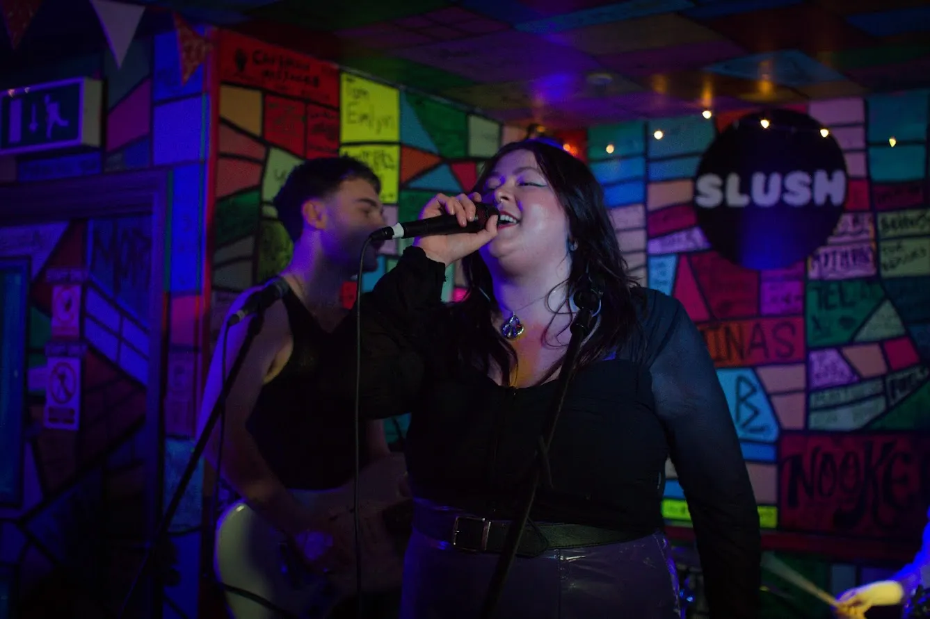 Next up was Accü, who delivered a captivating synth-heavy set blending shimmering melodies with a cinematic edge. Singing in both Welsh and English, she seamlessly moved between languages while showcasing her talents not just as a vocalist and songwriter, but also as a skilled producer. Using a looper, she built each track live. Layering vocals, synths, and beats to create a rich, dynamic sound. Performing solo, she effortlessly shifted between delicate moments and powerful rhythms, holding the audience’s attention throughout.